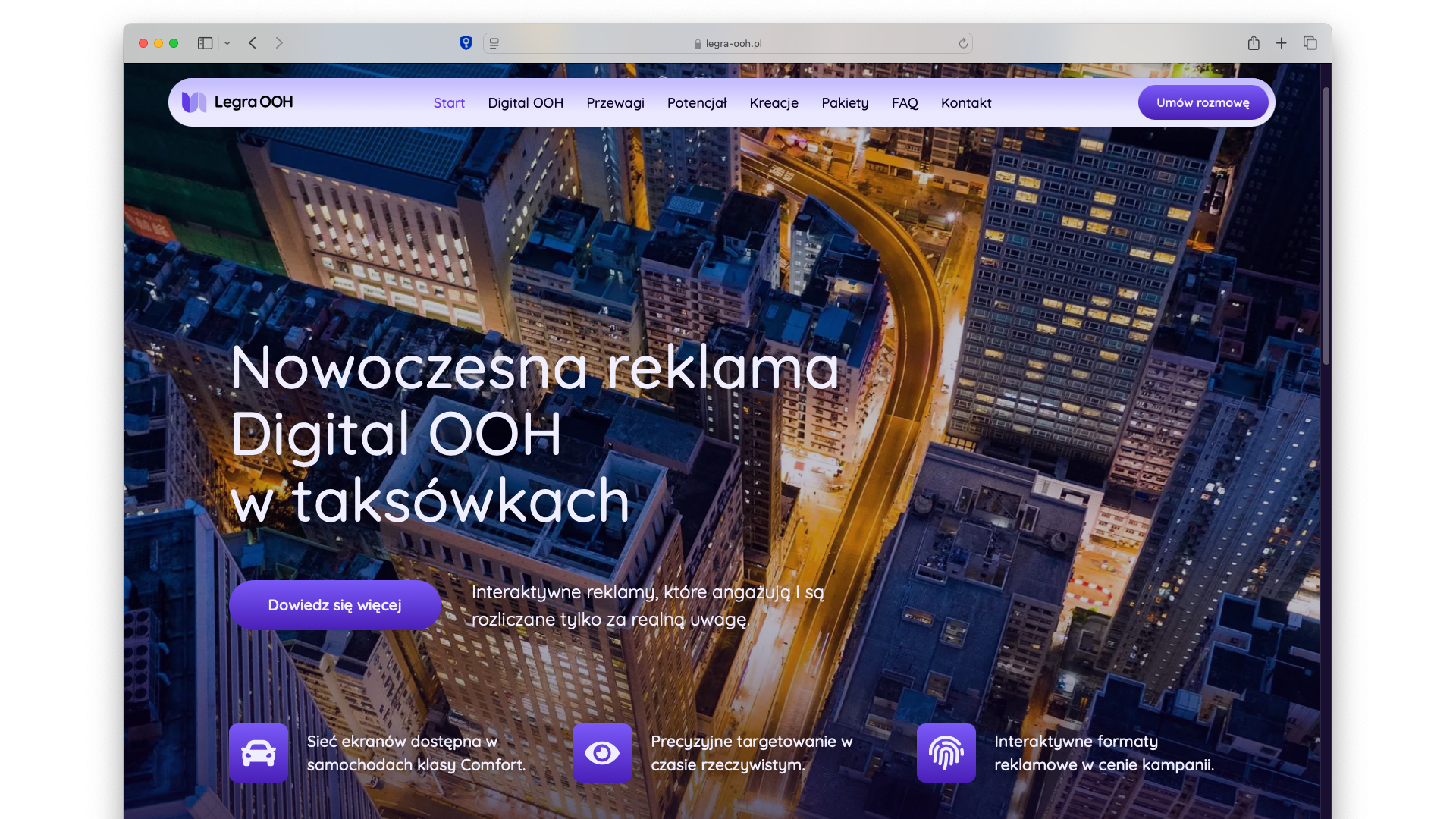 Strona internetowa dla firmy Legra-OOH zajmującej się nowoczesną reklamą Digital OOH w taksówkach Uber, Bolt i FreeNow.